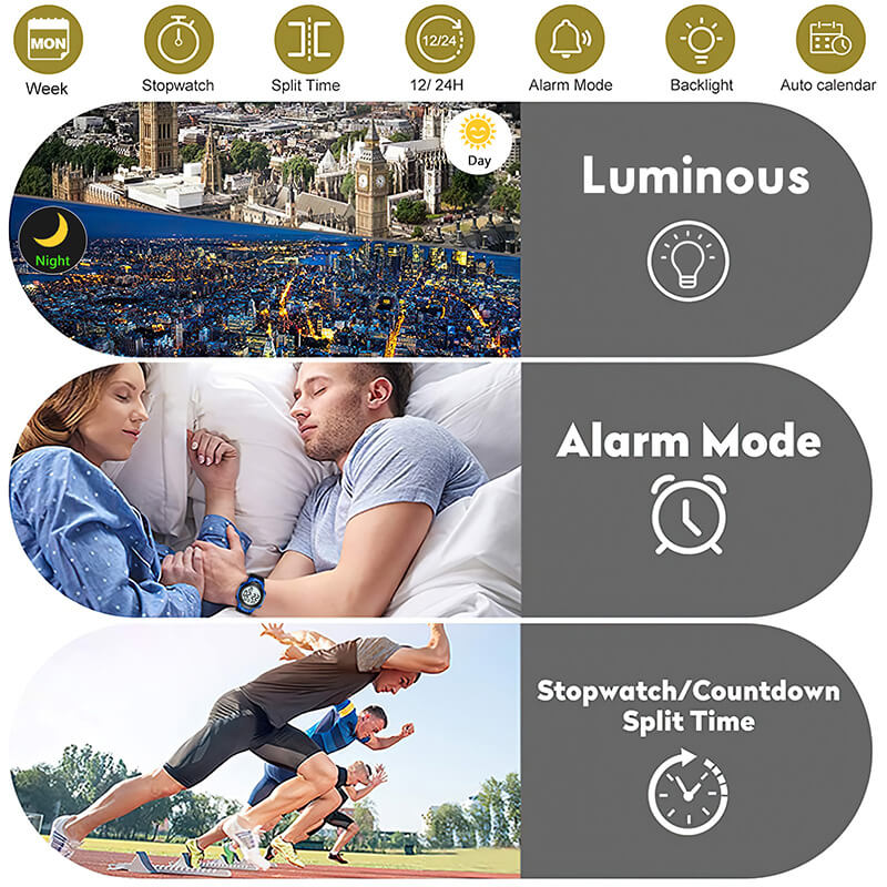 CIVO 1068C men watches with a rubber band offers versatile dual display and chronograph features. The watch is designed with a contemporary, sophisticated look, and features a night light for easy reading in the dark. It has a precision quartz movement for accurate timekeeping, and an adjustable stainless steel buckle for a secure fit. The watch also has an calendar,week, alarm, and other functions. A perfect choice for the fashionable man on the go.