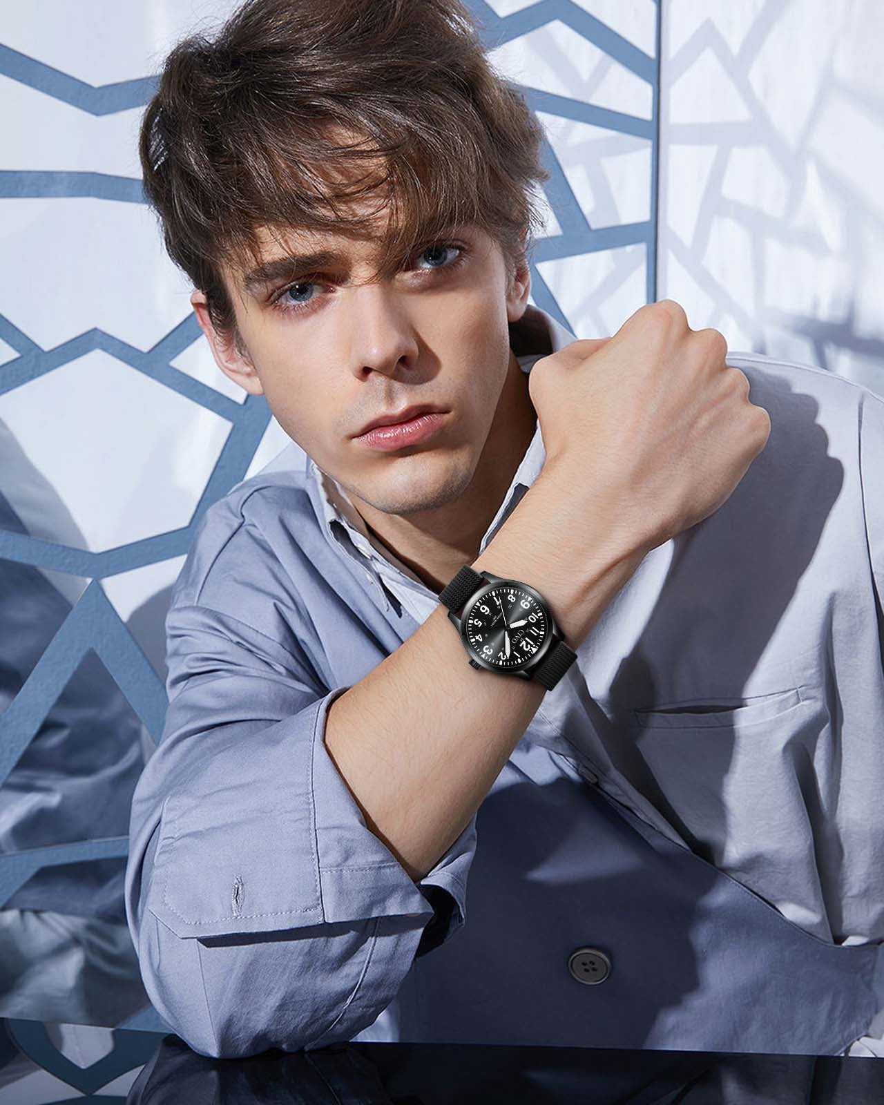 Quartz men's watches feature a sleek black rubber strap, a stylish round case, and a minimalist dial. The puristic and clear design lines of the quartz watch perfectly complement these elements, ensuring a dazzling and sophisticated appearance.